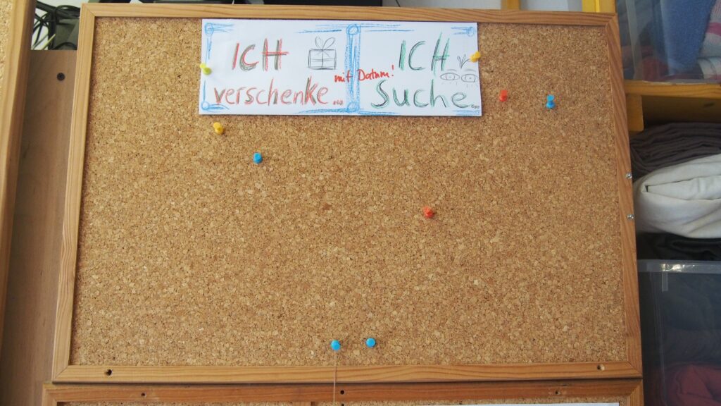 Wenn du deine sperrigen und großen Gegenstände weiter verschenken willst, kannst du vorbeikommen und dafür einen Zettel an unsere Pinwand hängen. Bitte Datum und Kontaktmöglichkeit dazu schreiben.