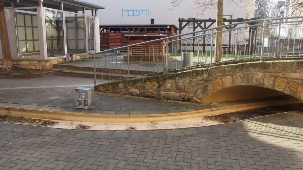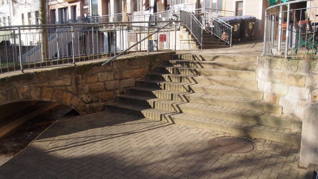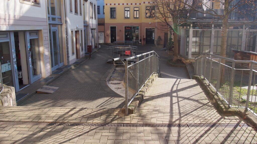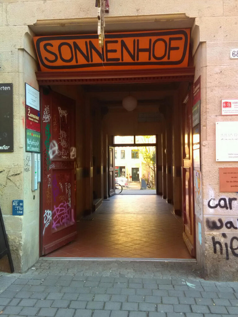 Über dem Zugang zum Hinterhof steht groß „Sonnenhof“. Zum Laden führt eine Treppe mit Geländer oder ein abfallender Gehweg. Der Gehweg ist mit Rollstuhl, Rollator, Kinderwagen und Einkaufstrolley befahrbar, besitzt allerdings eine relativ hohe, nicht ganz normgerechte Steigung.
