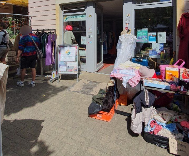 Wir als Umsonstladen nutzen – wenn wir es schaffen – die Gelegenheit und stellen unser Konzept vor, da der Trubel viele Neugierige in den Sonnenhof lockt. Je nach Kapazitäten bieten wir manchmal auch übrig gebliebenen Dingen Unterschlupf, bis sie ein neues Zuhause gefunden haben.